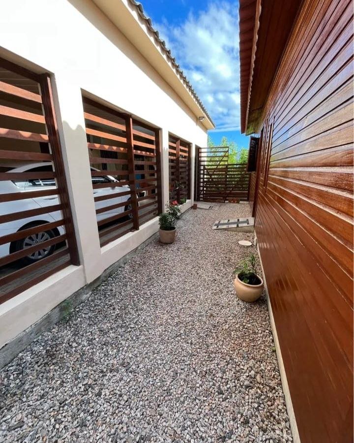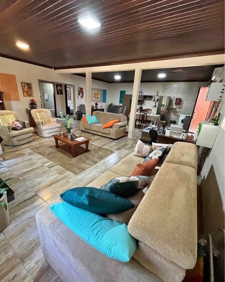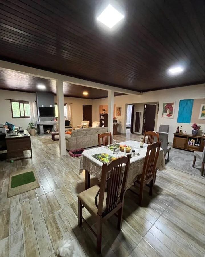 A casa principal em alvenaria, com 150 m², impressiona pela distribuição inteligente dos espaços. São 2 dormitórios, com possibilidade de um terceiro, sala e cozinha em conceito aberto, criando um ambiente moderno, amplo e acolhedor. A lareira traz aconchego nos dias frios, enquanto a churrasqueira transforma qualquer encontro em um momento especial. Conta ainda com garagem para dois veículos, garantindo praticidade no dia a dia.
