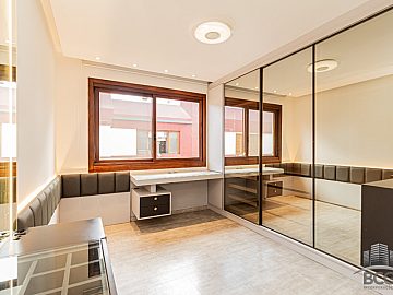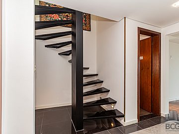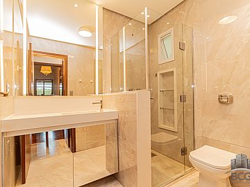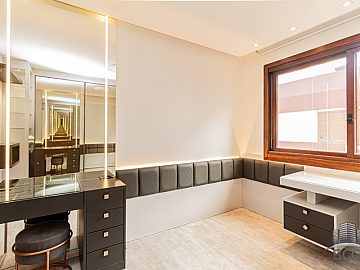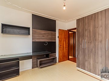 A área íntima é composta por quatro dormitórios, sendo duas suítes que garantem total privacidade e tranquilidade aos moradores. Cada espaço foi pensado para oferecer o máximo de repouso, complementado por um sistema de água quente que eleva o padrão de conforto térmico do imóvel. O lavabo e os banheiros adicionais atendem com discrição e funcionalidade às necessidades da rotina.