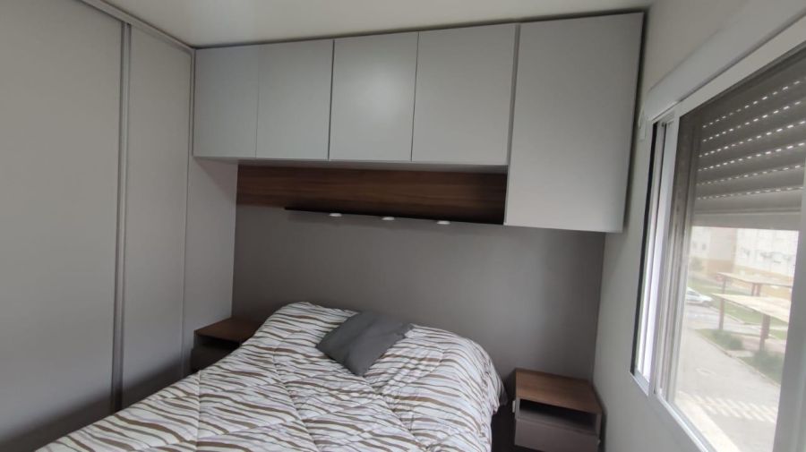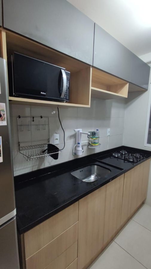 Com uma área privativa de 45m² meticulosamente aproveitada, a unidade destaca-se pelo seu estado semimobiliado, oferecendo uma transição suave e sofisticada para o novo proprietário. O layout interno é composto por dois dormitórios que privilegiam a tranquilidade, um banheiro social funcional e uma sala de estar que se integra perfeitamente ao conceito de bem-estar do imóvel. A área de serviço adjacente garante a funcionalidade necessária ao cotidiano, mantendo a organização e a estética dos ambientes principais.